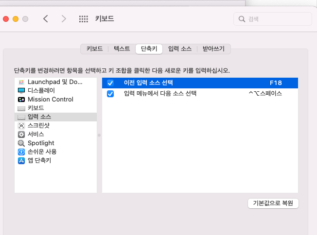 3. 키보드 > 단축키 > 이전 입력소스 선택해서 "right command" 입력하면 F18로 매핑됨